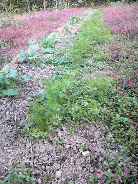 このニンジンは9月15日に播種した。涼しくなって生育盛ん。北に植えたノラボウ菜が厳寒期までに大きく育ち、ニンジンを防寒する。ニンジンは年が明けたら収穫を開始する。