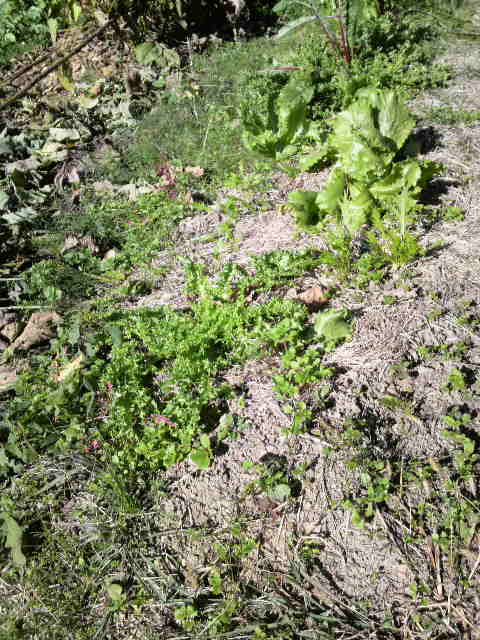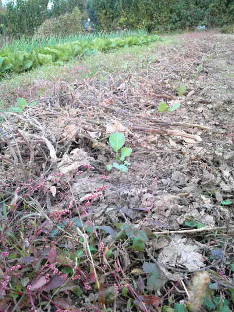 ラッキョの列とラッキョの列の間に生えているのは。雑草ばかりではないか。まてよ。そのなかに、コカブが5個だけ育っているではないか。