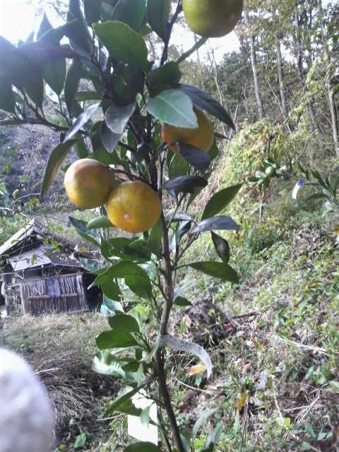 山際にミカンの苗を3本植えた。2年目。2本の木に着果した。おいしいミカンがなったら、もっともっと植えよう。風情のある構築物はストーブ燃料の薪小屋と製麦施設。