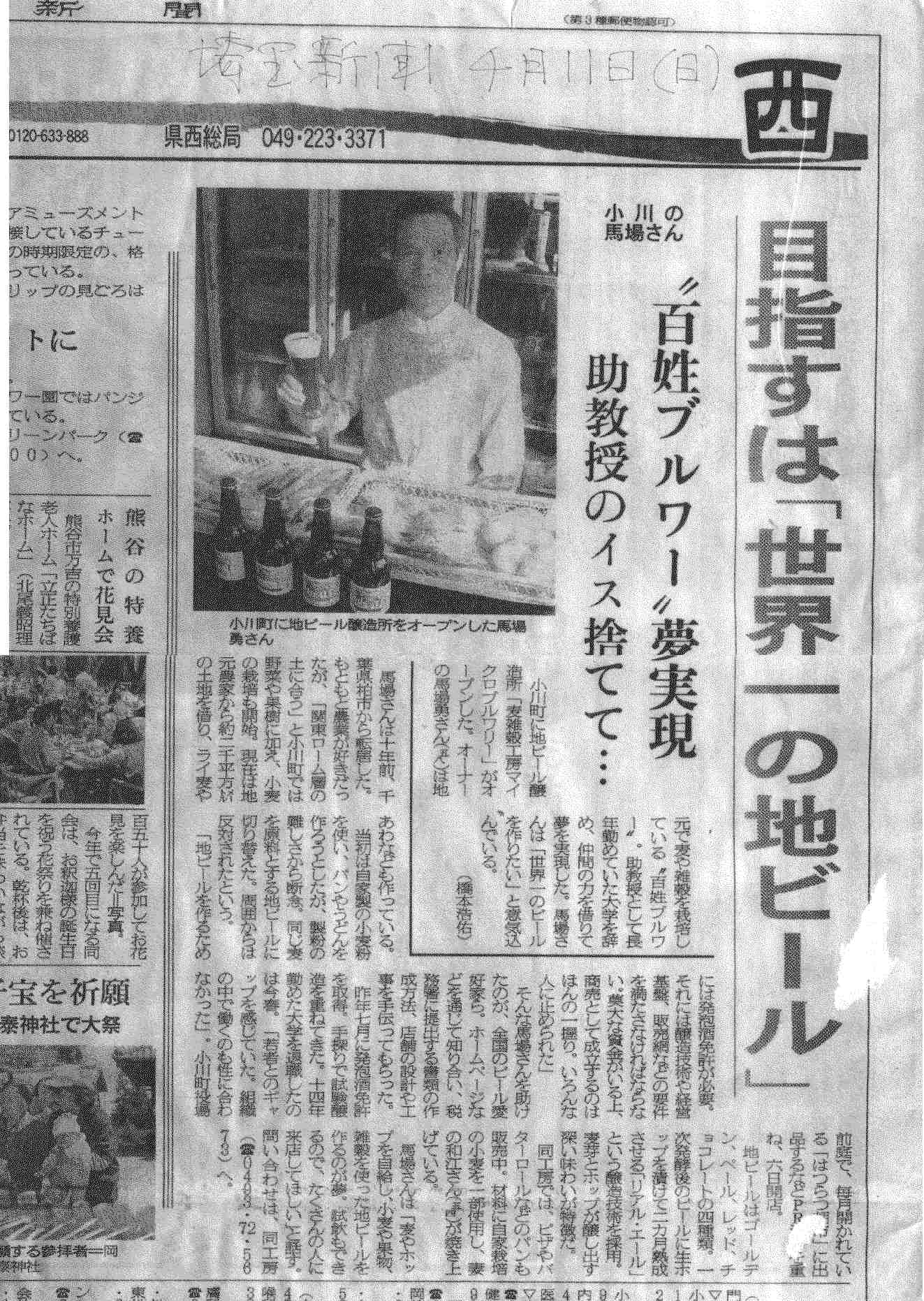 *埼玉新聞 2004/4/11朝刊 面「西」トップ見出し 目指すは「世界一の地ビール」
