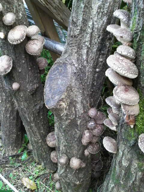 この原木は昨年2月中旬に伐採して3月中旬、1mほどに16本カットして植菌(低中温性:日本農林種菌鰍キその360)した。発生時の今ごろ、ブルーベリーの日陰に立掛ける。