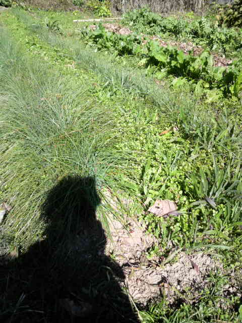 ラッキョの列とラッキョの列の間に生えているのは。雑草ばかりではないか。まてよ。そのなかに、コカブが5個だけ育っているではないか。