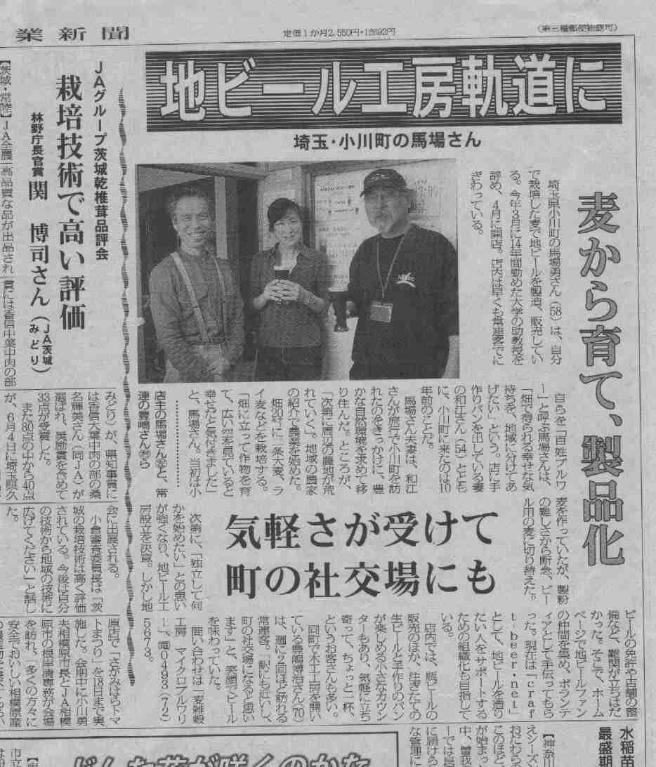 *日本農業新聞 2004/5/22 9面「首都圏」トップ見出し 地ビール工房軌道に