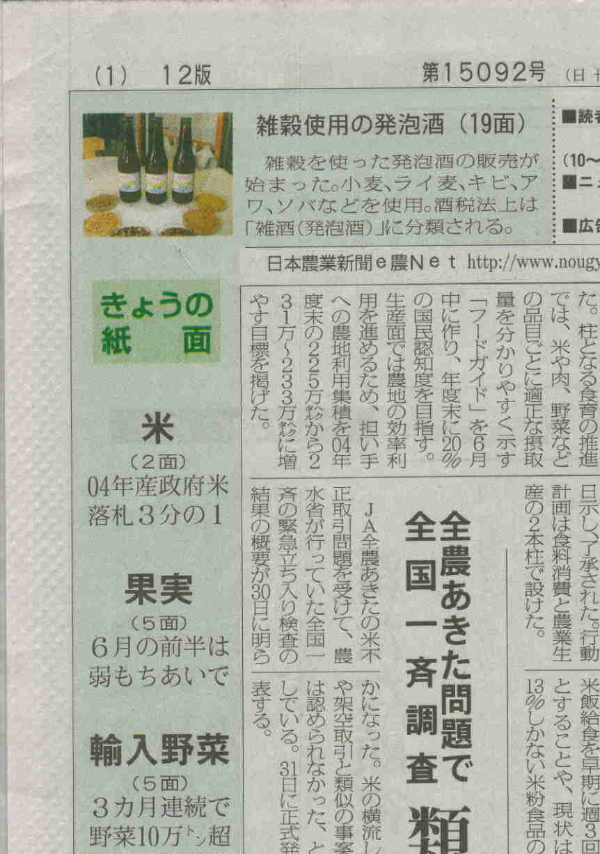 *日本農業新聞 2005/5/31 1面の見出し「きょうの紙面」 最上段にカラー写真付で掲載