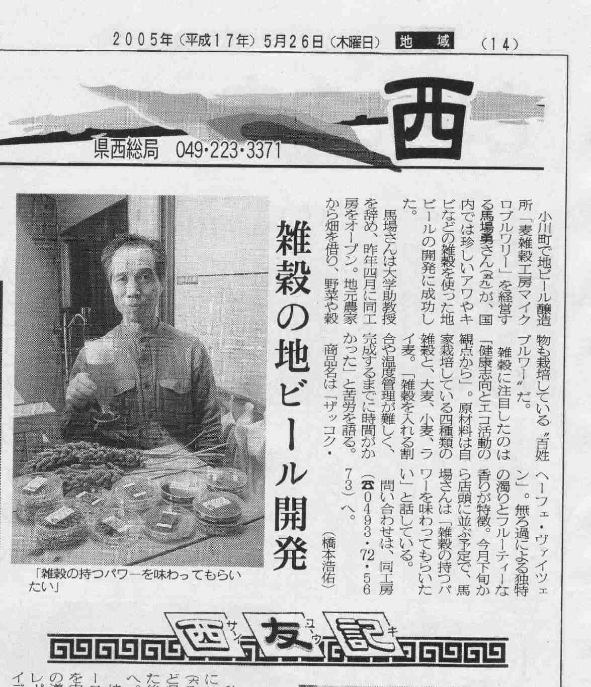 *埼玉新聞 2005/5/26朝刊 14面「西」トップ見出し 「雑穀の地ビール開発」