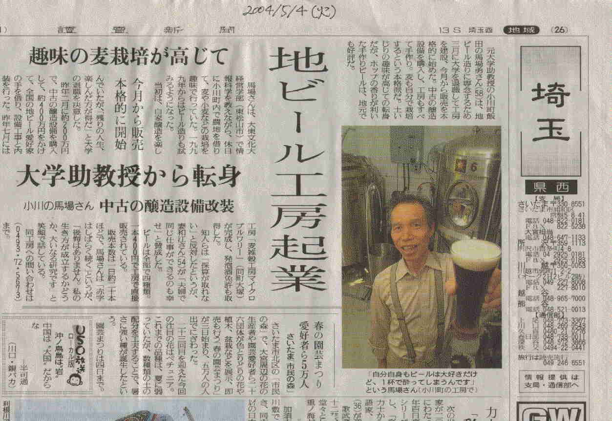 *読売新聞 2004/5/4朝刊 26面「埼玉」トップ見出し 地ビール工房起業